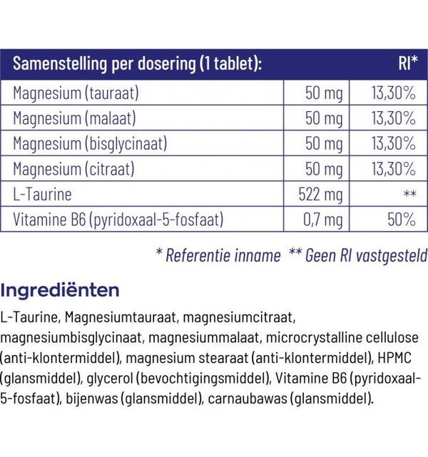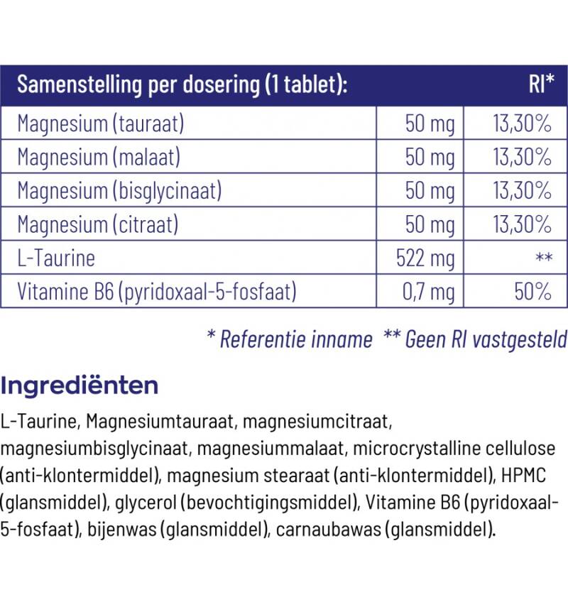 Ingrediënten: L-taurine, magnesiumtauraat, magnesiumcitraat, magnesiumbisglycinaat, magnesiummalaat, microcrystalline cellulose (anti-klontermiddel), stearinezuur (anti-klontermiddel), HPMC (glansmiddel), glycerol (bevochtigingsmiddel), Vitamine B6 (pyridoxaal-5-fosfaat).