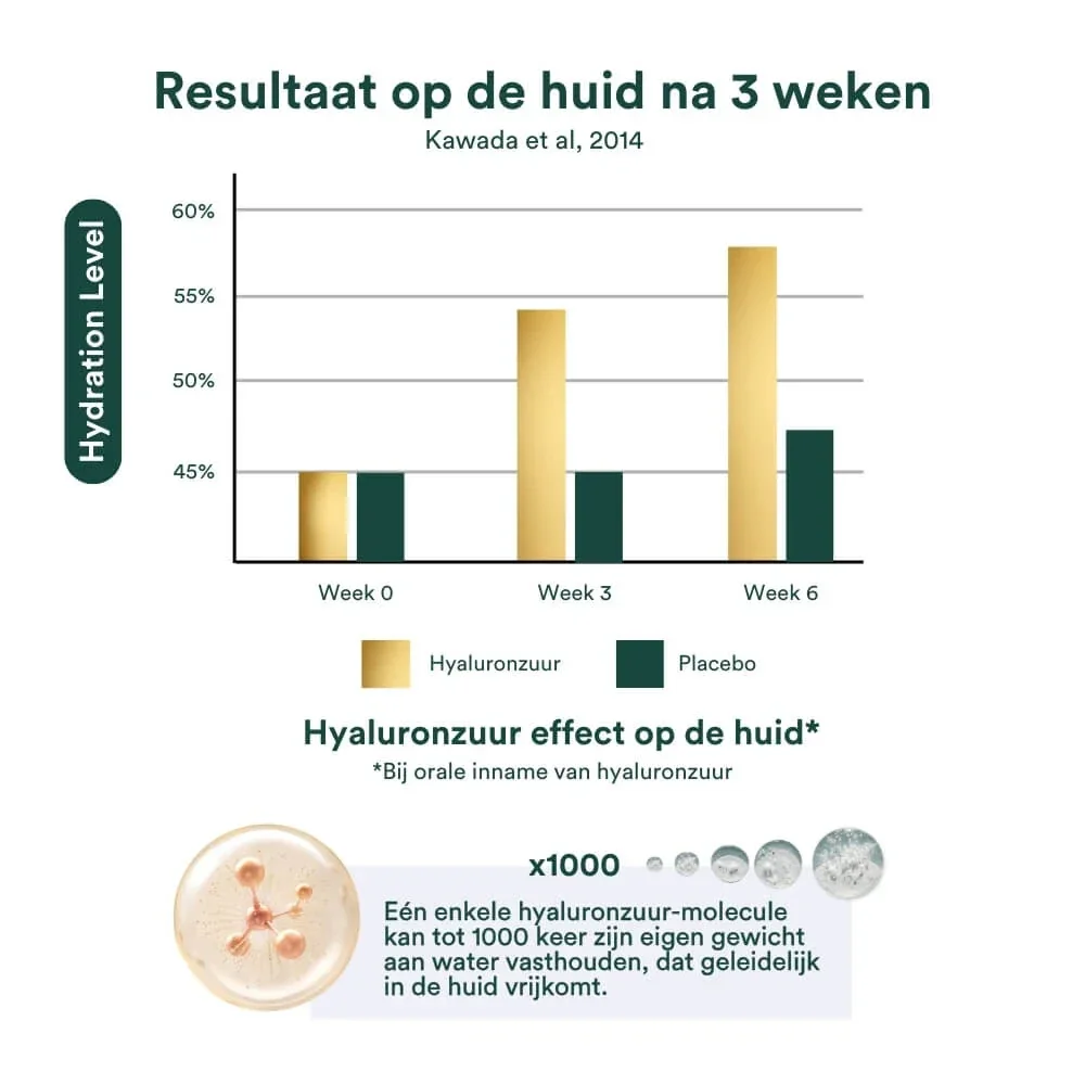 Dankzij 5x meer hyaluronzuur heb je een optimaal gehydrateerde en vollere huid van binnenuit. Na 3 weken inname tonen gepubliceerde studies* zichtbare resultaten op je huidhydratatie en glow. H5-NADH™ staat gekend voor jouw skin longevity, kortom huidvitaliteit.