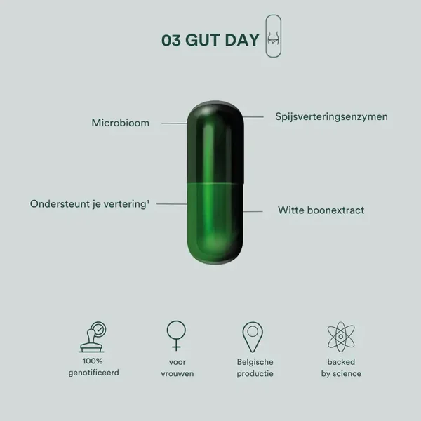 Zingiber officinale (Gember) en Angelica archangelica L (engelwortel extract) zijn de krachtige ingrediënten van Gut Day die je spijsvertering op natuurlijke wijze ondersteunen.²