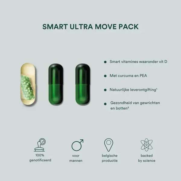 In 01, 02, 03 naar soepele gewrichten. De pack Smart Vitamins + Detox Boost + Ultra Move bevat bevat de smart vitamines, de unieke Lipogluthatox™ formule en hét geheim voor soepele gewrichten.³